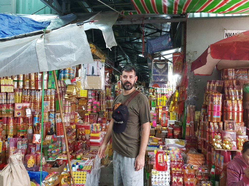 Una mica més descansats ens vam dirigir cap al Cholon, el Barri Xinès de Ho Chi Minh. Volíem veure el Mercat de Binh Tay i fer una volta pels voltants, on ens van assegurar que podíem tastar els mítics entrepans d’herència francesa, els Banh Mi. Ens semblava tan curiós que a Vietnam es fessin entrepans amb una espècie de pa de baguette… Per arribar-hi vam agafar un taxi vinasur, que és el que solen recomanar ja que utilitzen taxímetre i no fan coses extranyes. Com a recomanació, agafeu aquests o uns altres, sempre demaneu que posin el taxímetre en marxa, ja que sinó després us podeu trobar que us cobren una xifra desorbitada per un trajecte curt.