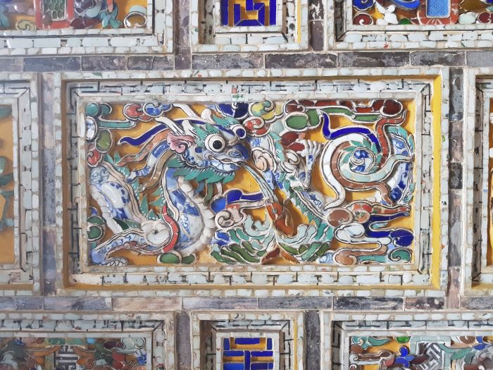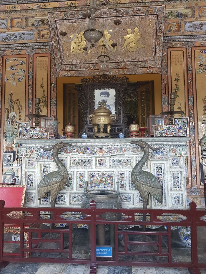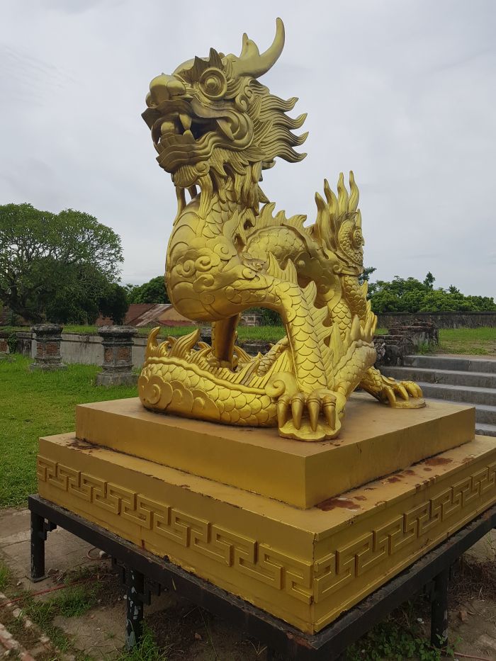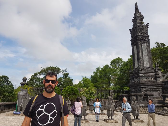 Vam començar per la Tomba de Khai Dinh, el dotzè (i últim) emperador de la dinastia Nguyen, que es va acabar de construir el 1931 després de més de 10 anys de treballar-hi. La barreja d’estils és molt xocant així com l’evident influència francesa en alguna de les decoracions, tot i tenir una estructura molt asiàtica. Crida molt l’atenció la successió d’escales custodiades per dracs; sembla que a través de l’ascensió cap a la tomba es vulgui donar oportunitat de gaudir de l’entorn i de les vistes, que són part important de la bellesa del recinte.