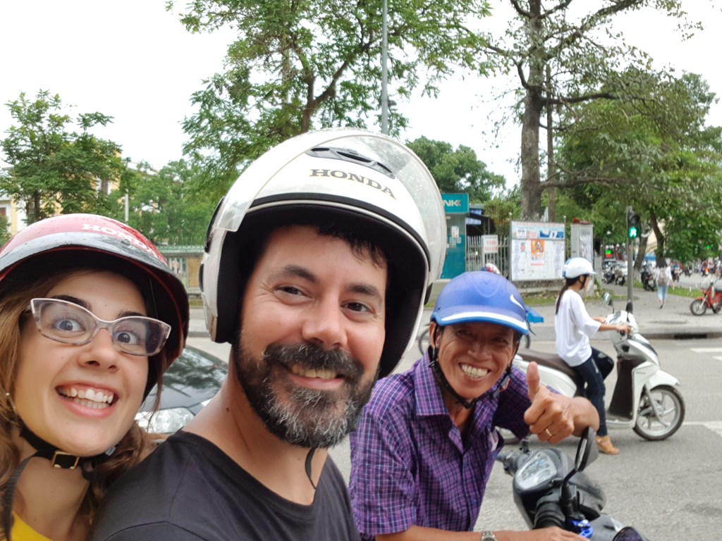 No teníem massa clar si anar a buscar el senyor Lac o era massa tard però el destí va triar per nosaltres i vam conèixer un altre personatge d’aquells que et marquen el viatge. Sortint de la ciutadella vam conèixer un homenet molt agradable anomenat Tri que ens va resoldre un dels “problemes” del viatge: el dia següent seguíem la ruta cap a Hoian però no volíem anar en transport públic ja que et perds un munt de cosetes que hi ha pel camí. Havíem llegit que hi havia gent que ho feia en cotxes o furgonetes privades o fins i tot en moto i la idea ens cridava força l’atenció. Total que el Tri ens proposava exactament això: dur-nos en moto a Hoian passant per un munt de llocs xulos que incloïen salts d’aigua, les famoses Muntanyes de Marbre o el Hai Van Pass, un pas de muntanya amb unes vistes espectaculars. Vam estar mirant vídeos que ens ensenyava de clients anteriors i una llibreta que venia a ser el seu particular TripAdvisor. Ens va convèncer una gent que, en català, explicava la seva experiència i lloava les virtuts del Tri i del seu cunyat, l’altre conductor de moto.
