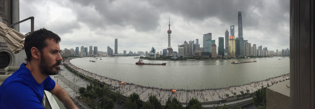 Després d’un dinar ràpid a un Subway vam decidir pujar a un bar que hi havia a dalt d’un dels edificis del Bund. Allà ens vam adonar que no encaixàvem gens amb les nostres robes de turista ressuat en un lloc tot fi… però vam gaudir molt de les vistes, el Jaume d’una cervesa i la Mar d’un batut deliciós!
