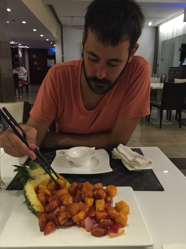 Al vespre vam anar a sopar al que ens havien dit que era “el millor restaurant de Shanghai”. Ens va costar molt de trobar, per arribar-hi havies de pujar en un ascensor tot atrotinat… però un cop vam ser-hi va començar l’espectacle: gambes agredolces i pinya, poma amb foie… Deliciós!