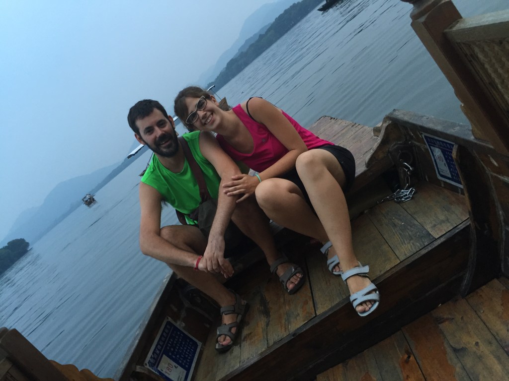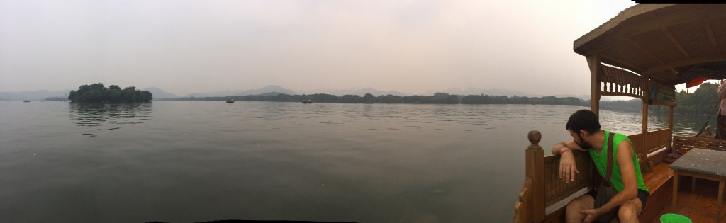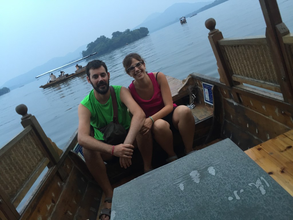 Vam decidir arribar a l’illa per camí més llarg, en processó amb milions de xinesos i libèl·lules de la mida d’elefants. La Mar es va comprar un gelat amb gust de suavitzant i vam estar passejant per tota l’illa fins que vam decidir agafat un barquet. La idea original era agafar un vaixell per creuar tot el Llac fins a la zona comercial, però no hi havia manera de trobar-ne cap. Així que ens van fer un passeig en barqueta (l’home de remar en sabia un rato, però de fotografia no tant! Ens va voler fer unes fotos i cadascuna era més torta que l’anterior… vam riure una estona!)