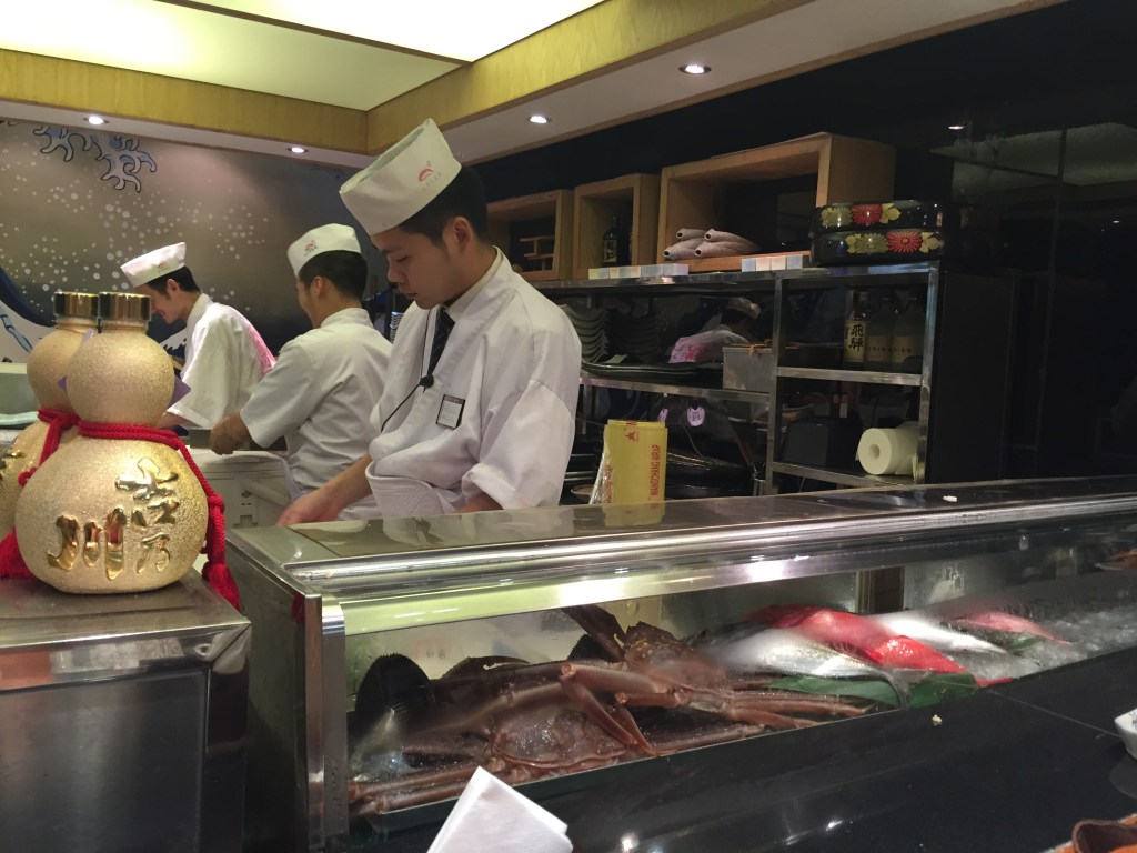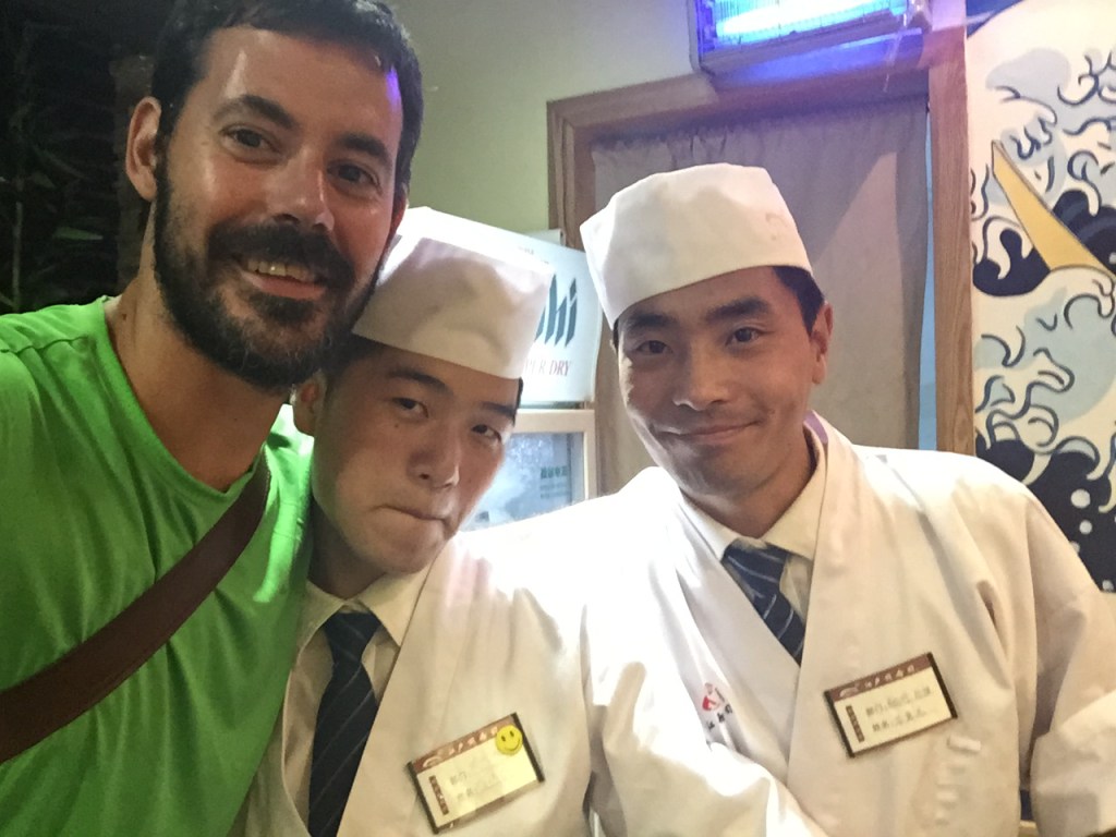 Quan ja érem a terra ferma, ens vam acostar a la zona comercial on ens vam menjar un gelat (no jutgeu a la Mar, el primer tenia molt gust a suavitzant!), vam passejar, vam veure botiguetes, restaurants… semblava mentida veure tot allò quan feia tant poc érem enmig de camps i camps de te! Després de veure una mena d’espectacle d’aigua i llums que feien amb unes fontetes dins el llac, vam decidir sopar en un japonès. Van ser molt atents i agradables, el menjar era boníssim i com que havíem estat fent broma amb els cuiners i cambrers, al marxar van voler-se fer un selfie amb el Jaume que, sense voler, preparant-se per la foto, va pegar un cop a un d’ells. El cas que sort de tot això, perquè quan vam sortir a buscar taxi per tornar cap a l’hotel enmig de les muntanyes i camps de te, els taxistes que veien que no fèiem cara de locals, no ens volien agafar de cap manera! Vam tornar al restaurant i els vam explicar el que ens passava, de manera que un d’ells va sortir, va demanar un taxi amb la mà i quan aquest va parar, ens va fer pujar per darrera dissimuladament, de manera que quan el taxista se’n va adonar ja érem dins!!