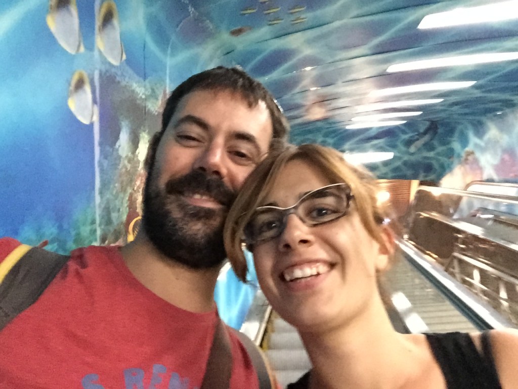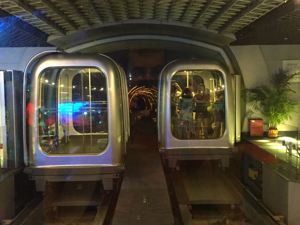 Després vam creuar al Pudong per veure els edificis de ciència ficció i per fer-ho, vam creuar pel túnel més turístic i estrany per on passarem mai a la vida! Es tracta del Bund Sightseeing Tunnel: primer baixes unes escales mecàniques que et deixen sota el riu i allà t’espera una espècie de vagoneta futurista que et porta per un túnel de gairebé 700 metres amb música, llums espasmòdiques i veus que van dient coses. Ho vam trobar molt epilèptic, però com que ens va semblar molt xinorrio-asiaticós, podríem dir que ens va encantar (això ho escriu la Mar… el Jaume crec que ho va trobar epilèptic – asiaticós i prou!)!
