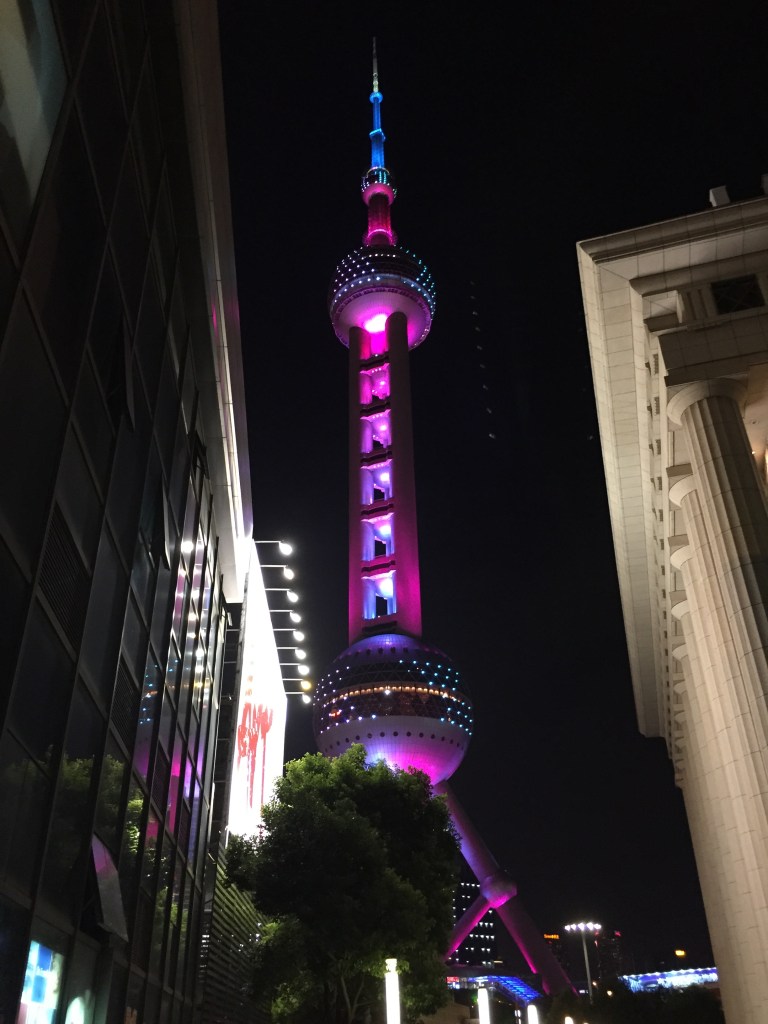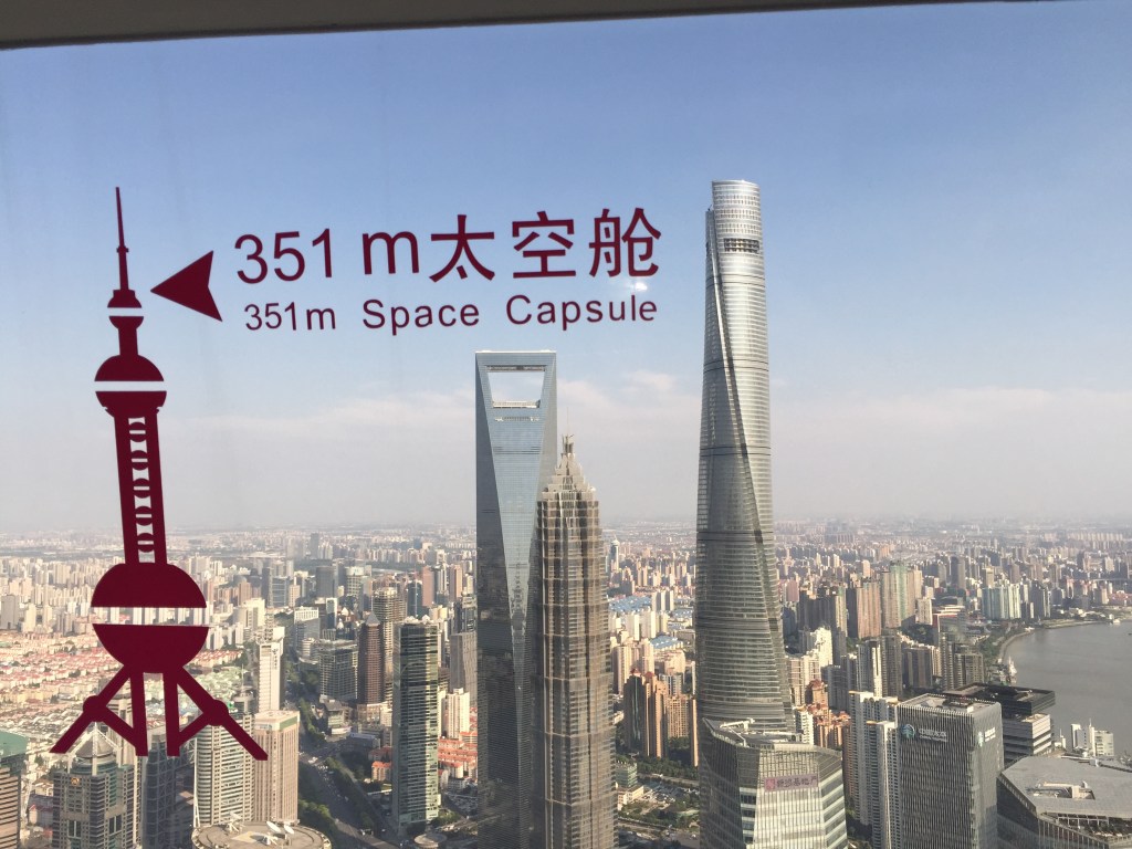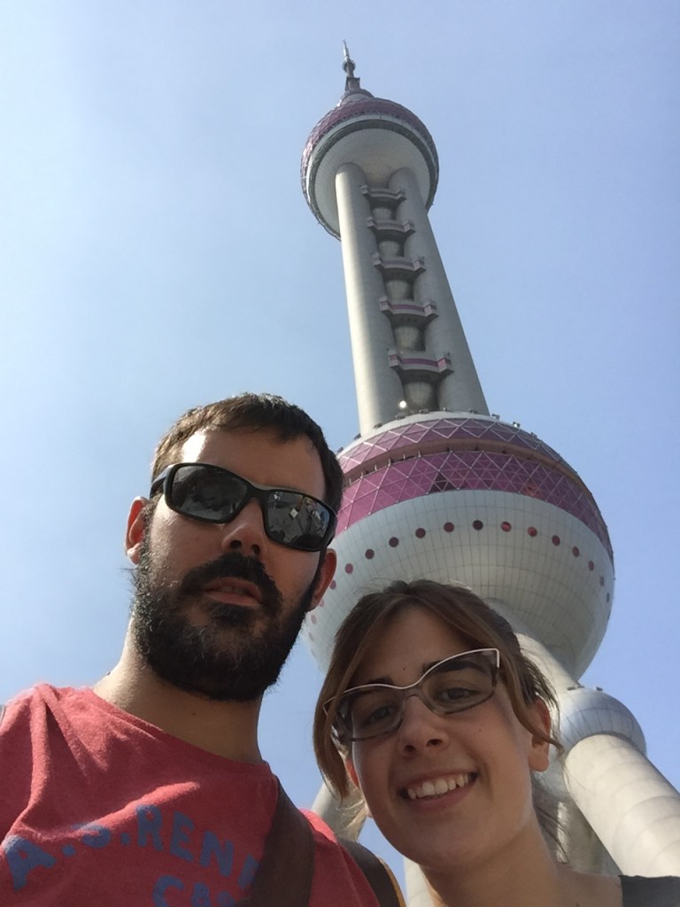 Un cop al Pudong tocava decidir a quin edifici pujar. Vam decidir-nos per la Torre de la Perla d’Orient (la de les 3 boletes), ja que ens semblava la més original i, des d’aquest edifici podríem veure els altres (realment també pensàvem en la opció de pujar a un altre edifici després… no imaginàvem que la visita s’allargaria tantíssim!). La Torre de la Perla d’Orient és una torre de telecomunicacions que medeix 468 metres i va ser construida l’any 1994 i, tot i que es va convertir en un símbol de la ciutat i n’estan molt orgullosos, va costar molts diners. Així doncs, van decidir promocionar-la com una atracció turística posant restaurants, museus i recreatius dins perquè la gent hi anés. Tot i això, creiem que els turistes la visitem bàsicament per les vistes!