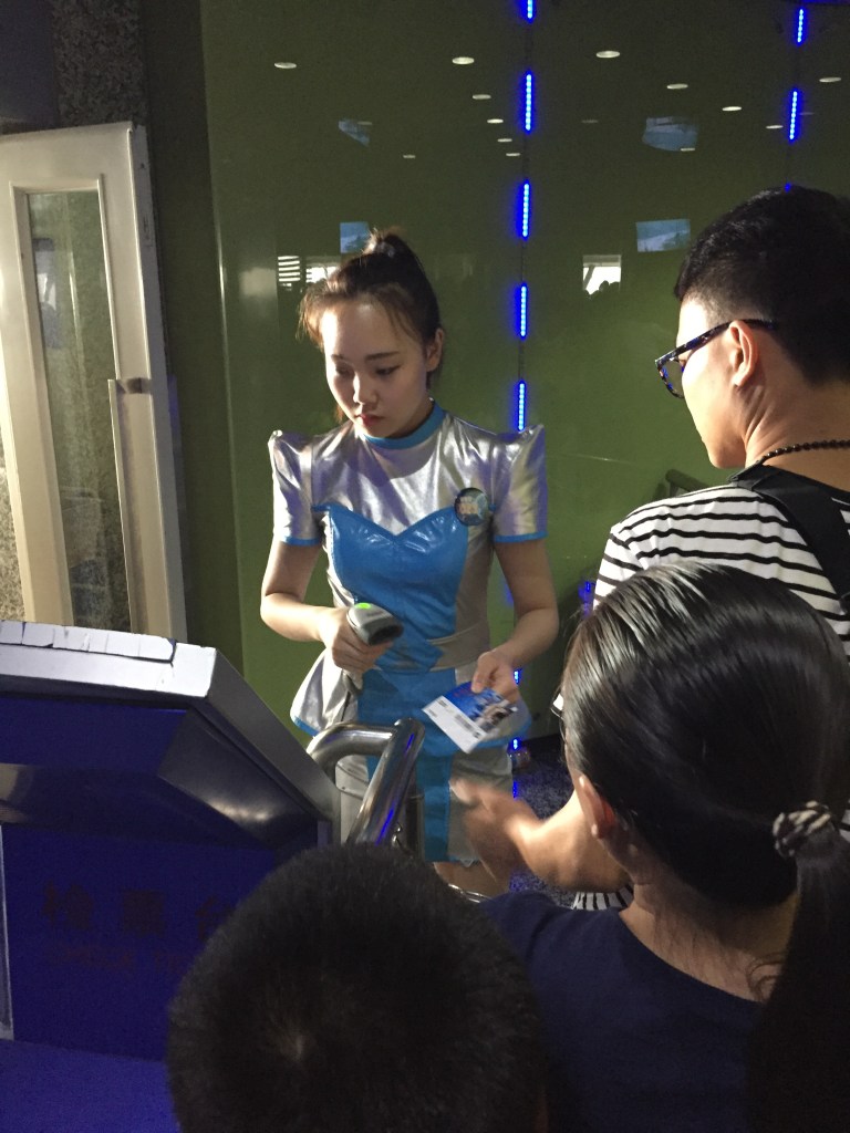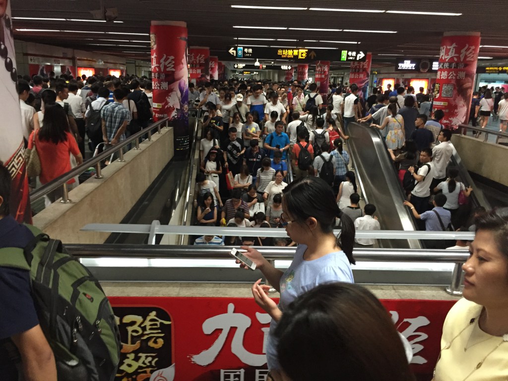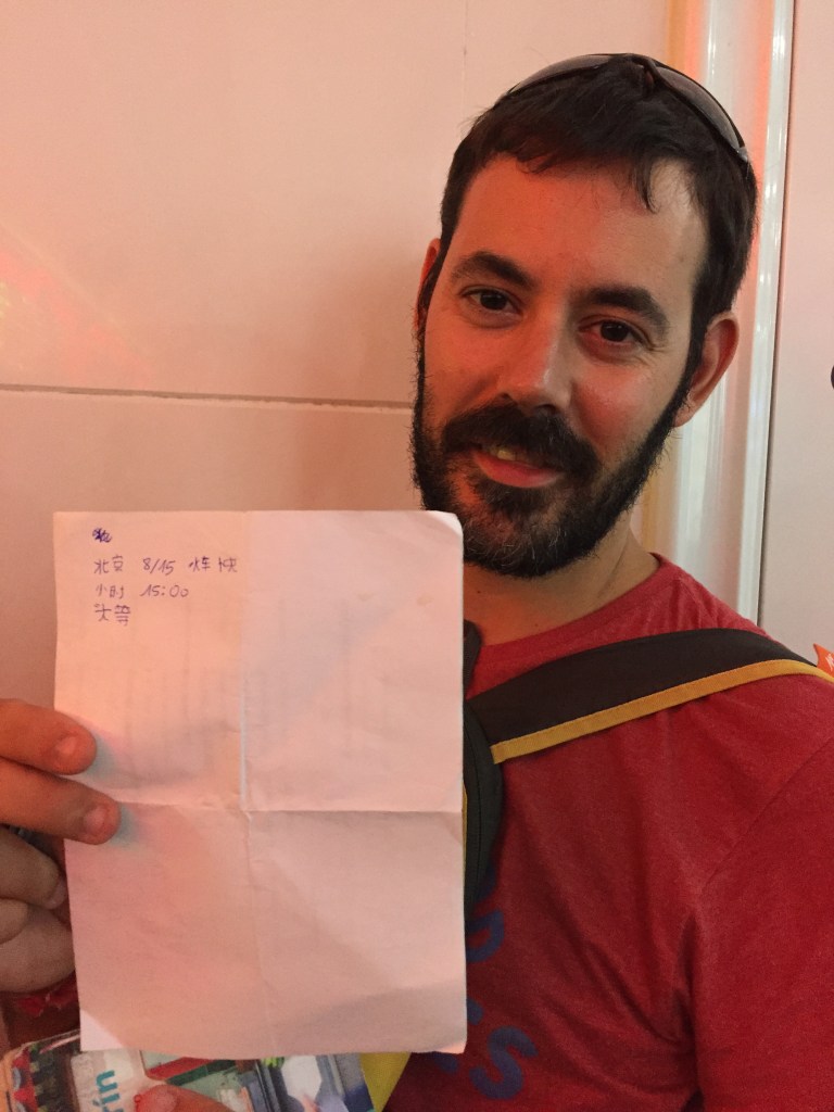 Al sortir de la Torre de la Perla vam anar cap a l’estació de tren més propera per comprar bitllets de tren per anar a Beijing. La compra de bitllets va ser una aventura en si mateixa: trobar on comprar-los, totes les màquines estaven en xinès, quan vam trobar com fer-ho ens vam adonar que no teníem diners (això és culpa nostra!), ens vam dividir i mentre el Jaume feia cua a la finestreta “en anglès” (que mai parlava en anglès) la Mar va anat a treure diners.