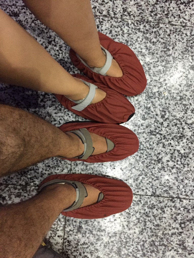 Vam triar la opció cara, que ens donava dret a pujar a totes es boles (les 3 grans i les intermitges on hi havia recreatius, una espècie de tren de la bruixa…). En general l’experiència va ser bastant agobiant, ple de moments d’espera, llargues cues, aglomeracions, situacions tenses en què la gent s’intentava colar… La Mar es va quedar adormida fent cua i tot! El recorregut començava fent una hora i mitja de cua a les típiques tanques de parc d’atraccions. Després de l’enèssim control de bosses ja pensàvem que entràvem, però ens esperava una altra cua per agafar el primer ascensor. Aquest et deixa a 250 metres d’alçada i has de fer una altra cua on et fan posar unes sabatilles (com uns peucs per damunt les sabates) i unes dones vestides de “dones del futur d’anunci de lleixiu” per fer-ho més temàtic de l’espai t’acompanyen fins a dalt de tot.