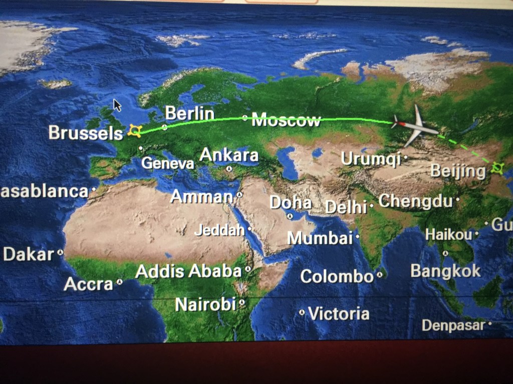 Aquest era el nostre primer viatge llarg, després d’haver voltat més o menys per Europa durant anys i una breu escapada a Marrakech. El vol Barcelona – Brusel·les va ser molt còmode i tranquil, però el que ens duria de Brusel·les a Beijing amb Hainan va ser una mica més dramàtic. Suposo que deu estar fet en mida xinesa, però jo que anava assegut al seient de finestra, havia de tenir el cap semi de cantó o em topava amb el sostre. La oferta d’oci era més aviat discreta (un joc de futbol dels anys 20 i no massa pel·lícules, totes subtitulades en xinès que no et deixava veure qualsevol altre subtítol que volguessis afegir) i un menjar que ens vam embotir perquè no teníem massa més opció.