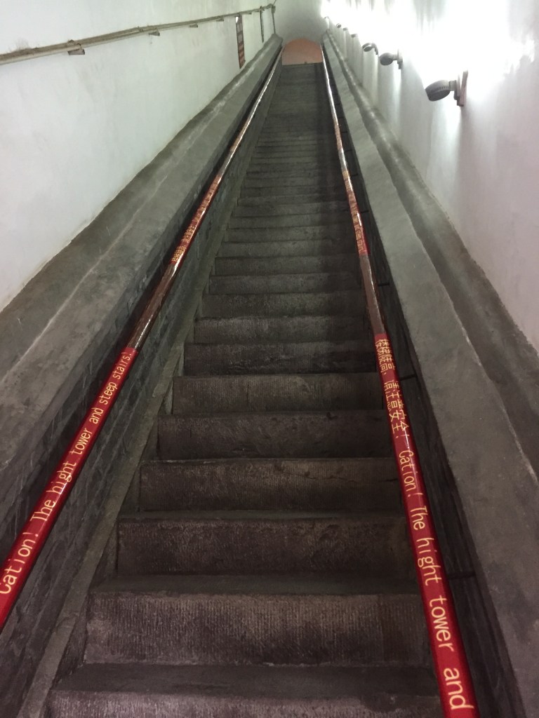 A l’entrada de la torre ens esperaven unes escales infernalment empinades que, sumades al jet lag i al dia i mig sense dormir, se’ns van fer més que pesades. Feien vertigen i tot…I nosaltres ens preguntavem: com ho fan persones de 1,30m amb aquelles cametes tan curtes? i fins i tot hi pujaven senyores grans totes encorvades i en talons!