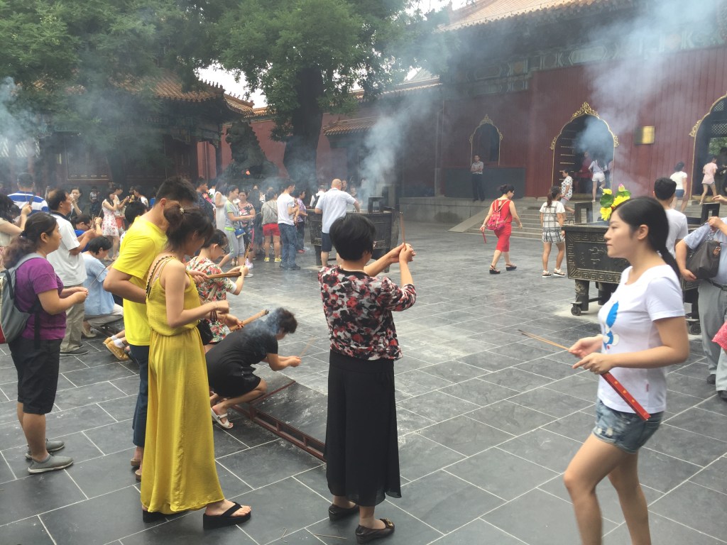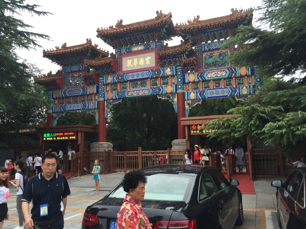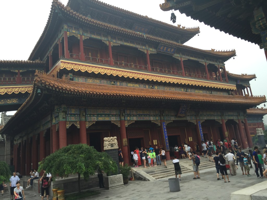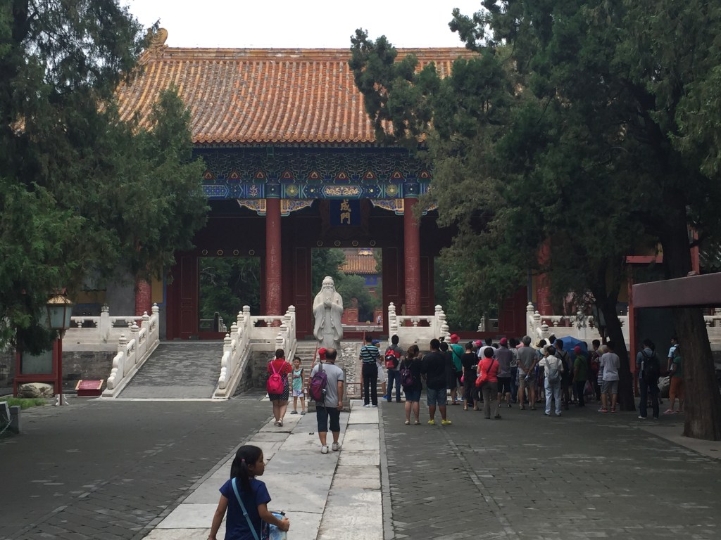 Eren les 11 del matí però estavem cansadíssims; a més amb el cel de Beijing no érem incapaços d’endevinar l’hora que era. La Mar s’estava a punt d’adormir cada cop que deixàvem de caminar, així que ens vam dirigir al primer temple que visitaríem a Xina: el Temple de Confuci. Vam fer bé de visitar-lo abans del dels Lames, a 150 metres del primer, ja que és molt més modest. Tot i això, la seva importància és eminentment històrica i cultural i en aquest sentit val molt la pena. A l’interior del recinte s’hi troben 190 esteles amb els 13 clàssics confucians gravats i s’escau perfectament amb el típic recinte sagrat xinès, amb les seves teulades, el seu color vermell inconfusible i els seus recintes amb les ombres dels arbres que s’agraeixen tant. Ara, hauríem agraït alguna explicació en no xinès, ja que es fa complicat de seguir.