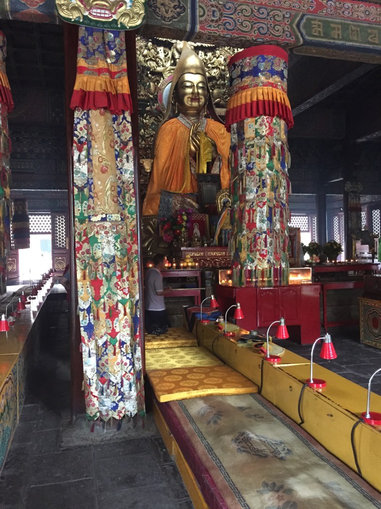 Vam sortir i ens vam dirigir al Temple dels Lames que, com us deia abans, és molt més espectacular i bonic. Quin senyor temple… Què dic temple, TEMPLES, perquè podies estar entrant i sortint de llocs durant un bon rato i no te l’acabaves. I, com no podia ser d’altra manera, tot era no gran, sinó gegant. Per alguna cosa és el temple budista tibetà més important fora del Tibet. Ens vam quedar embadalits dels colors, les mides i les formes dels temples, però també una mica marejats dels milers de barres d’encens que cremaven a les teteres gegants de l’entrada.