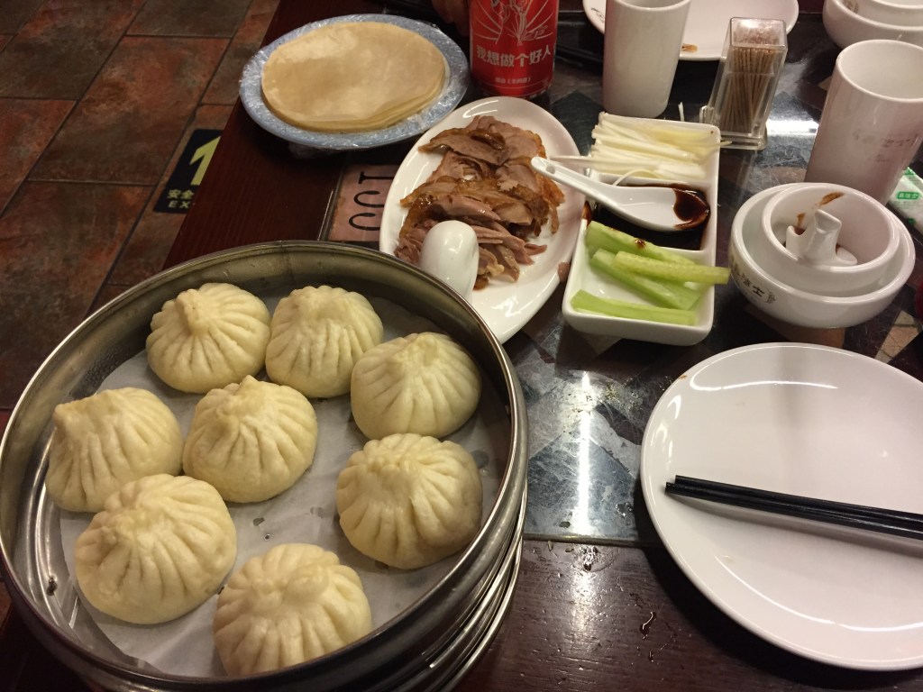 Com pertoca a una primera nit, vam decidir arribar a l’hotel caminant per fer-nos a la ciutat i, tot i que no les teníem totes per l’enormitat de Beijing i la nostra dificultat per entendre els noms dels carrers, vam aconseguir ubicar-nos i, previ pas pel Teatre Nacional (que ens va deixar impressionats per la seva forma i mida), vam arribar a la zona de l’hotel, on vam buscar un lloc on menjar dos dels plats més típics de la gastronomia xinesa i, en especial, de la ciutat: l’ànec Pekin i els dumplings. No podem dir si era el cansament o que el lloc no estava massa bé, però tal i com l’ànec mentre era calent era bo, els dumplings no ens van agradar gens, massa llefiscosos i amb un farciment més aviat soso. S’ha de dir que els restauradors xinesos no destaquen per la seva amabilitat. En aquest cas, la dona ens pressionava constantment per demanar més plats i a mig sopar ens va venir a portar coberts com dient que el nostre estil amb els bastonets era més aviat reprobable.